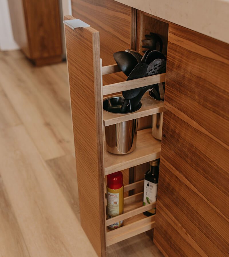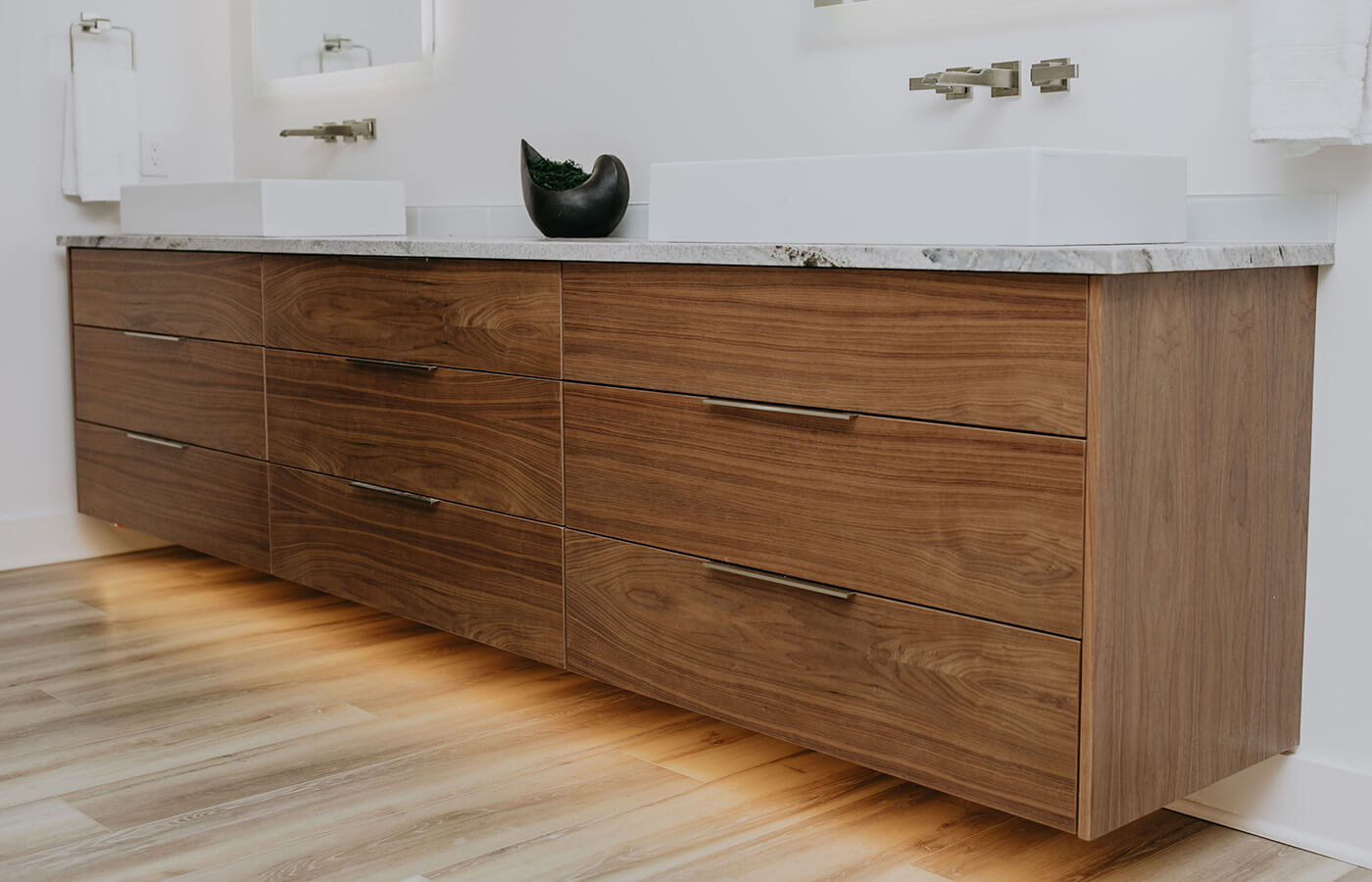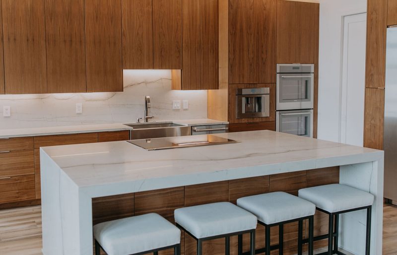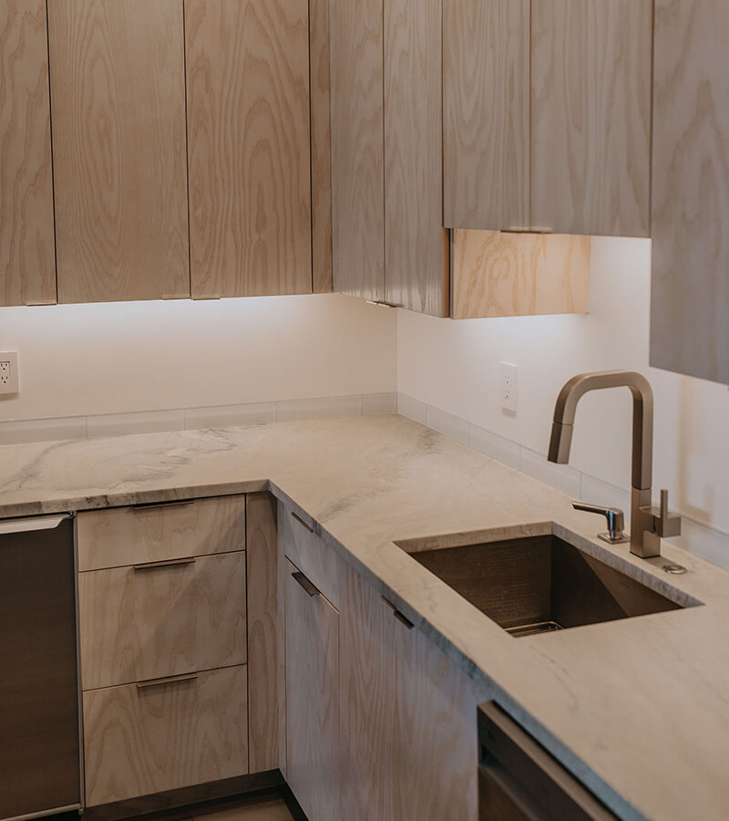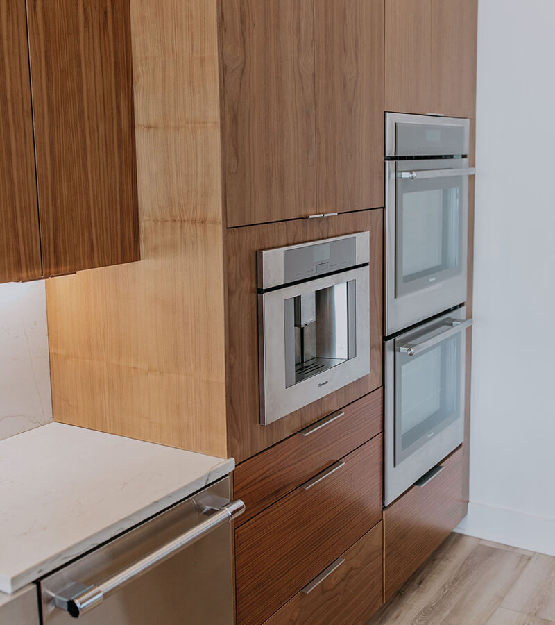 This cabinetry project focused on European full overlay designs, delivering a modern and streamlined look. The use of walnut and ash not only adds warmth and sophistication but also allows the wood’s natural beauty to shine through with minimal staining. Accent lighting plays a pivotal role in this design, illuminating the wood grains and creating a dramatic backdrop that draws the eye to the simple yet stunning cabinetry. The result is a harmonious blend of function and style, perfect for any contemporary space.